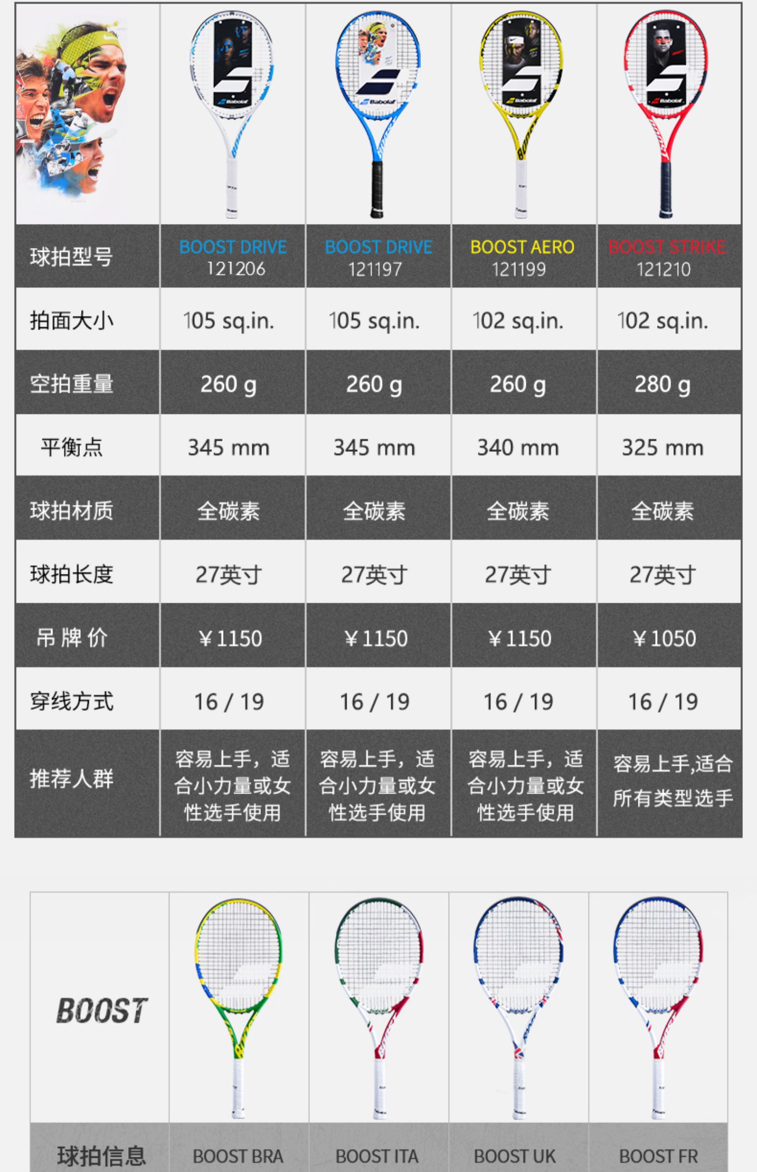 Babolat百保力网球拍李娜PD纳达尔boost大学生初学者网球拍全碳素