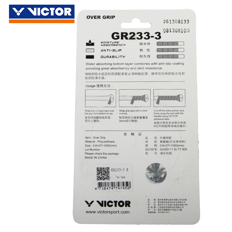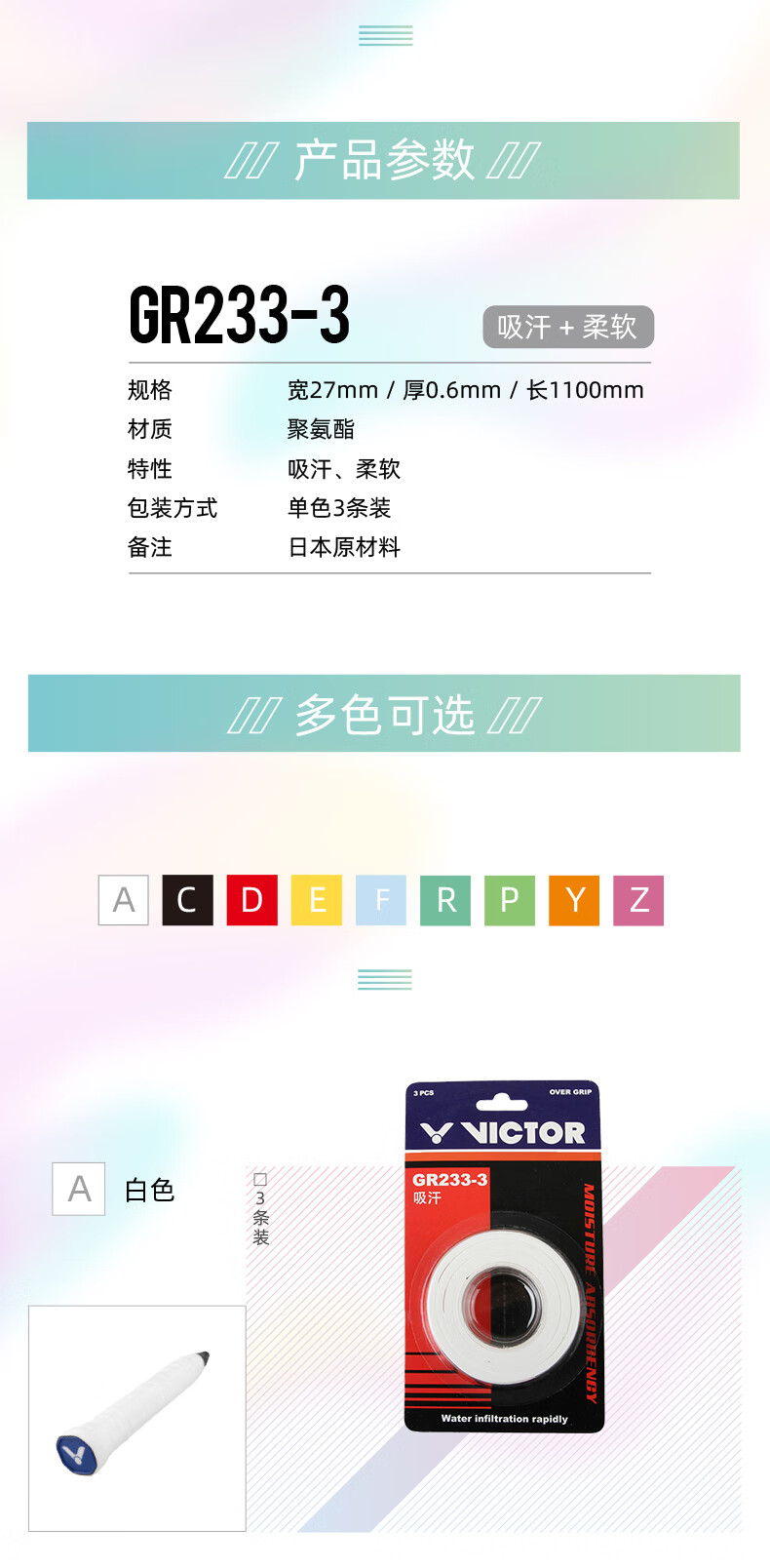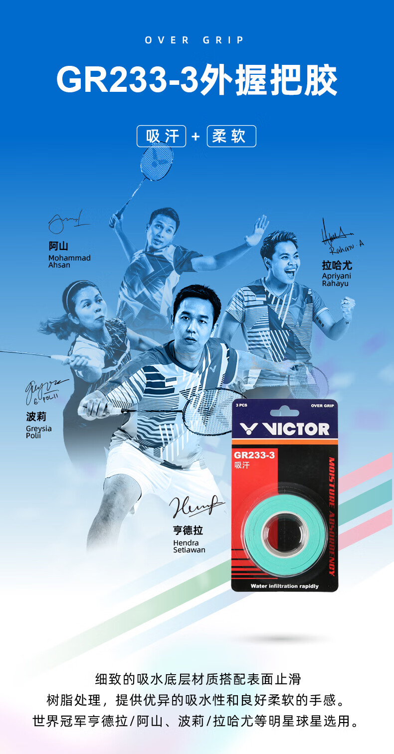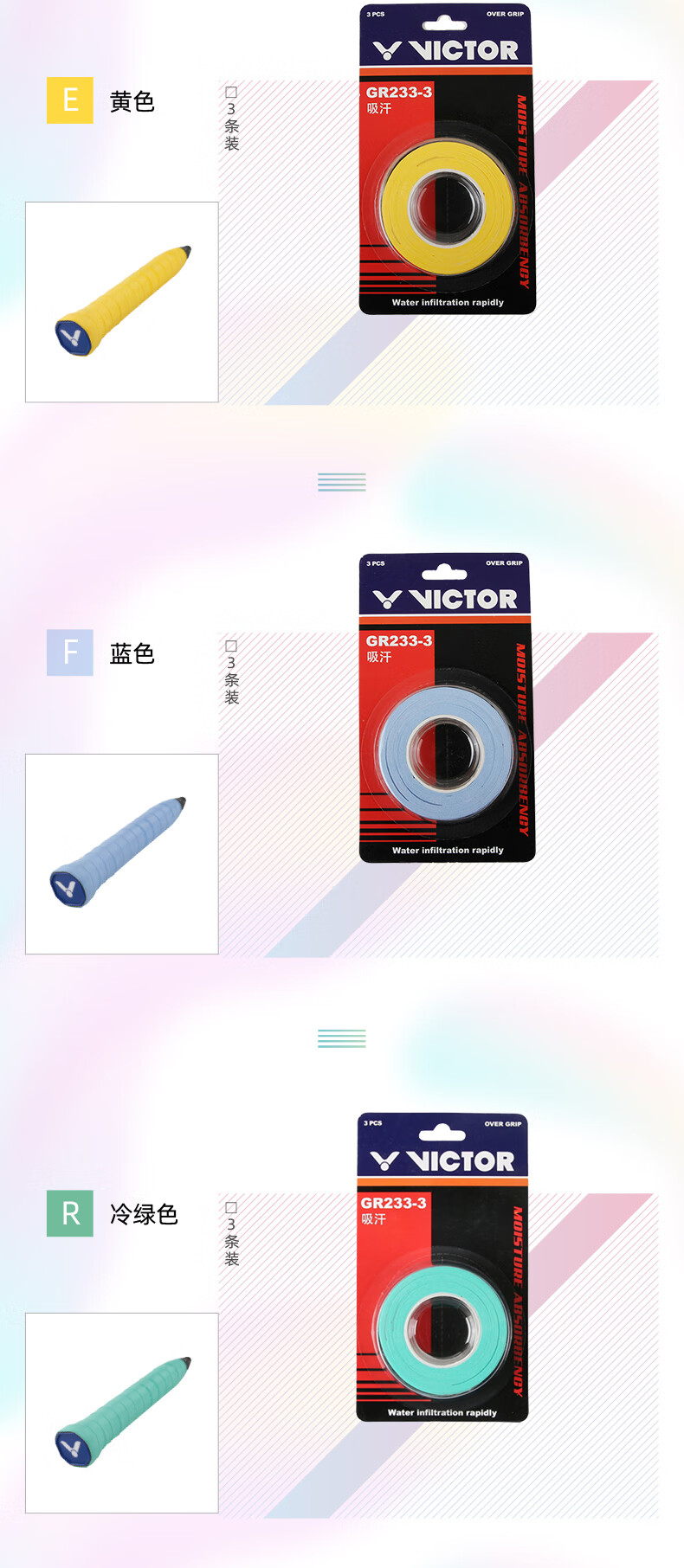 VICTOR威克多 羽毛球拍手胶 吸汗防滑羽毛球拍外握把胶3条装 GR233-3 外握把胶GR233-3/D