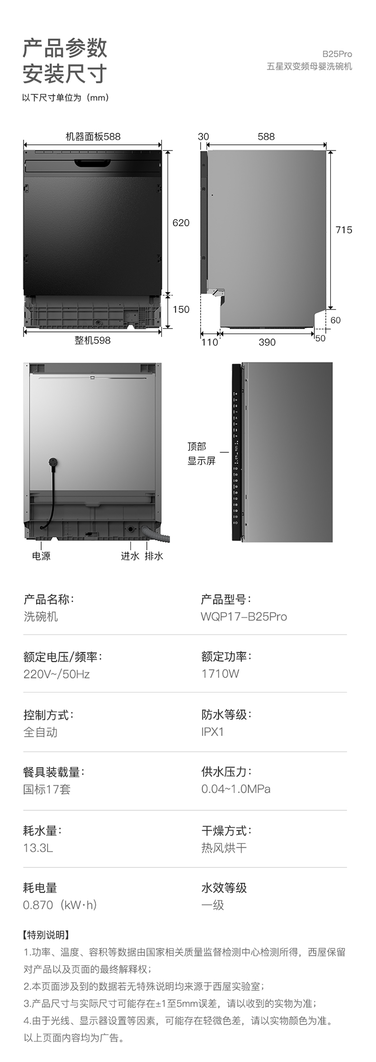 【新品上市】美国西屋 B25 Pro嵌入式洗碗机家用17套五星级消毒